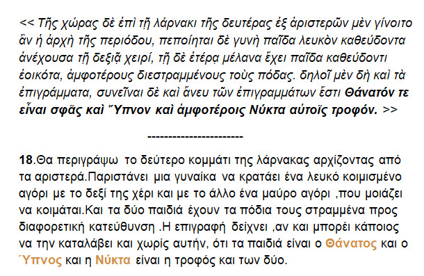 Η επιγραφή δείχνει ,ότι τα παιδιά είναι ο Θάνατος και ο Ύπνος και ότι η Νύκτα είναι τροφός και των δύο.