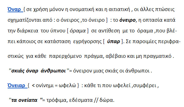 Όναρ : το όνειρο, η οπτασία κατά την διάρκεια του ύπνου [ όραμα ] σε αντίθεση με το όραμα που βλέπει κάποιος σε κατάσταση εγρήγορσης [ ύπαρ ] . »σκιάς όναρ άνθρωποι »= όνειρον μιας σκιάς οι άνθρωποι . Όνειαρ : {κάθε τι που ωφελεί ,συμφέρει ].