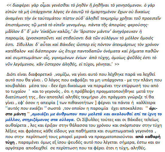 Υπάρχει διαφορά ανάμεσα σε ένα γεγονός που συμβαίνει ,αφού έχει ειπωθεί και σε ένα γεγονός που λέχθηκε, ότι θα συμβεί. Διότι το άπειρο γεννάει τα κάθε είδους γεγονότα .Εκείνος δε » που εικάζει με επιτυχία » ,δηλαδή ο »άριστος μάντης » μάλλον μοιάζει με άνθρωπον ,που στηριζόμενος στις πιθανότητες προσπαθεί να αναζητήσει τα ίχνη του μέλλοντος και ερευνά.