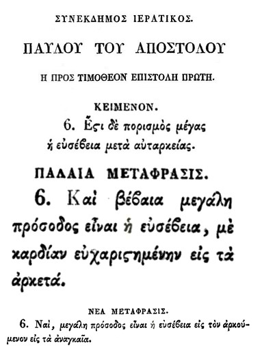 ΑΔ. ΚΟΡΑΗ – » Συνέκδημος Ιερατικός », AΠ . ΠΑΥΛΟΥ : Προς Τιμόθεον [ Α’. 6.6 ].