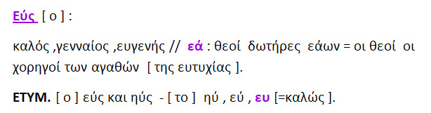 Εύς = καλός, γενναίος ,ευγενής. Ευ =καλώς .