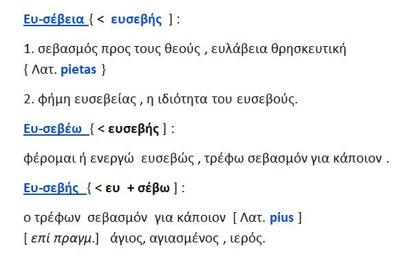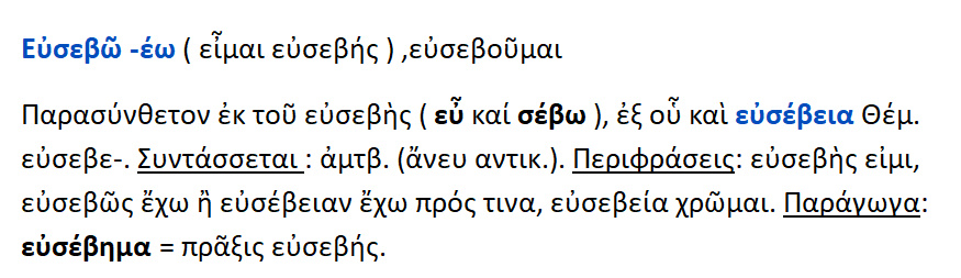 Ευσεβέω-ώ = είμαι ευσεβής, ευσεβούμαι { ευ + σέβω } > ευσέβεια. Ευσέβημα = πράξη ευσεβής.