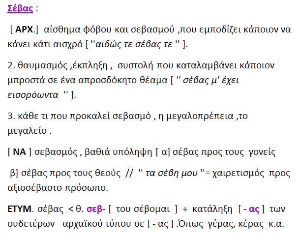 Σέβας : [ ΝΑ ] σεβασμός , βαθιά υπόληψη [ α] σέβας προς τους γονείς β] σέβας προς τους θεούς . 2. θαυμασμός ,έκπληξη ,συστολή