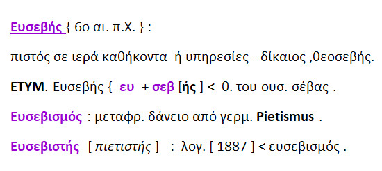 Η ευσέβεια [ π. ευσεβία ] είναι μία λέξη , η οποία αποφεύγεται ή μάλλον εκλείπει από το σύνηθες λεξιλόγιον του νεοέλληνα .Γενικώς οι σημαντικές λέξεις με το πρόθεμα [ ευ ] σπανίζουν ,εκτός βεβαίως από το σήμα κατατεθέν του νεοελληνικού βίου : την ευήθεια ,την ευκολία , την αρχή της ελάσσονος προσπάθειας ,τον κομφορμισμό. Η ευσέβεια δεν είναι απλώς το σέβας : σεβασμός, δέος ,αιδώς, ένα συναίσθημα φόβου μαζί με σεβασμό ή κάποια συστολή [ που σφίγγει την καρδιά κάποιου και τον εμποδίζει από το να πράξει κάτι αισχρὸν ]. Είναι ο σεβασμός μετά του τροπικού επιρρήματος ευ {= καλώς , ΛΑΤ. bene }. Η δυσσέβεια [ δυσ = κακώς ] είναι το αντίθετον της ευσεβείας : σεβασμός προς το Θείον, θεοσέβεια , ευλάβεια, { Λατ. pietas : σεβασμός προς τους γονείς , φήμη λόγω ευσεβείας ] .Σήμερα, ίσως ,σπανίζει η ευσέβεια ,διότι ο άνθρωπος διεκδίκησε και πήρε την θέση του Θείου με ό,τι αυτό συνεπάγεται . Η αιώνια τραγωδία του αλαζόνα θνητού ,που σκέφτεται και πράττει σαν να είναι αθάνατος Θεός θέλοντας να ορίσει ,όχι μόνον την ιδικήν του τύχη, αλλά και των άλλων ανθρώπων. Αναπόφευκτα όμως επέρχεται η Άτη στον νουν του εκάστοτε υβριστή και ολοκληρώνεται η τιμωρία του στο σκότος από τον ιερόν πέλεκυν της Νεμέσεως [ ένα από τα πιο φοβερά παιδιά της Νύκτας ]. Αυτοί οι άφρονες υπεράνθρωποι [supermen ] ,που δεν αντιλαμβάνονται ,ότι είναι θνητοί , oμοιάζουν με αυτούς ,που { σύμφωνα με τον Εμπεδοκλή } έχουν απωλέσει το κριτήριον της αληθείας , τον ορθόν λόγον , ο οποίος είναι ξυνός [ = κοινός ] ,δηλαδή και θεϊκός και ανθρώπινος .