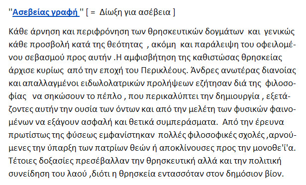 »Ασεβείας γραφή ‘‘ : Δίωξη για ασέβεια ,προσβολή κατά των πατρώων Θεών της πόλεως ή παράλειψη του οφειλομένου σεβασμού προς αυτούς . Για ασέβεια διώχθηκαν σπουδαίοι άνδρες όπως ο Αναξαγόρας , η Ασπασία , ο Σωκράτης , ο Αριστοτέλης , ο Διογένης ο Απολλωνιάτης κ.α.