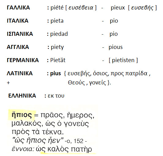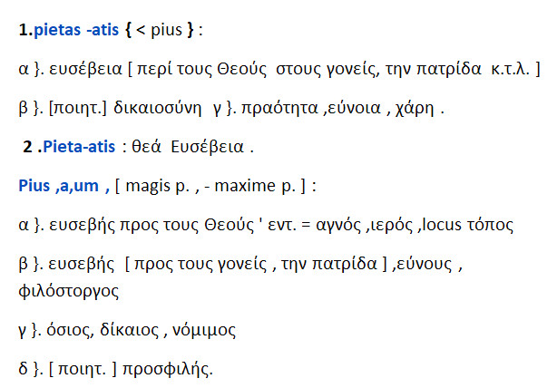 pietas -atis { < pius } : α }. ευσέβεια [ περί τους Θεούς , στους γονείς , την πατρίδα ] 2 .Pieta-atis : θεά Ευσέβεια . Pius ,a,um , : α }. ευσεβής προς τους Θεούς ,προς τους γονείς , την πατρίδα .