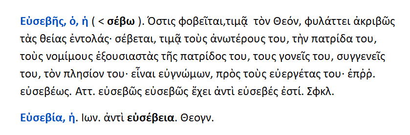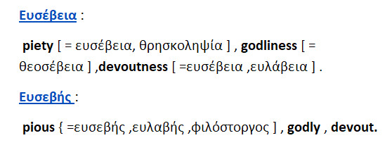 Ευσέβεια : piety , godliness ,devoutness .Ευσεβής : pious , godly , devout.
