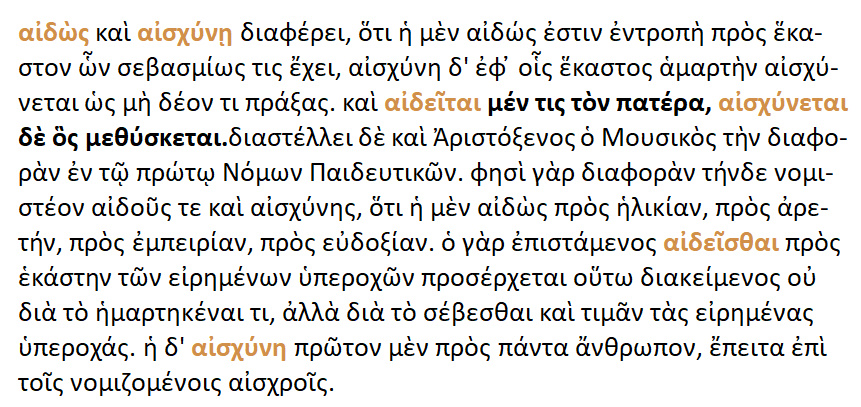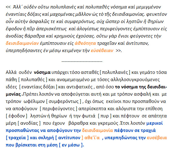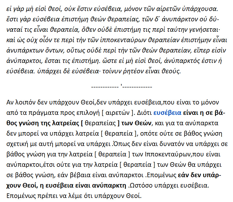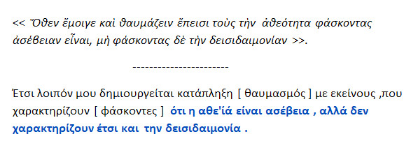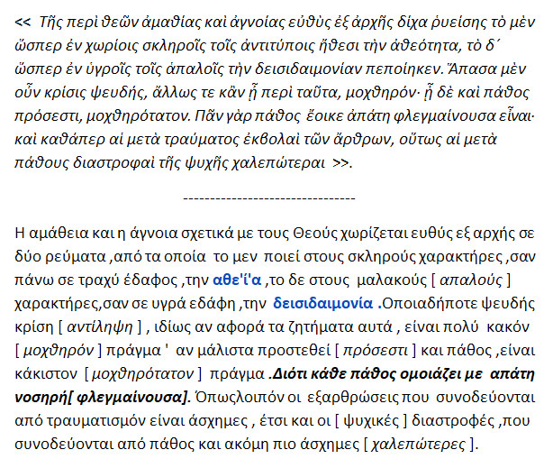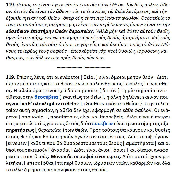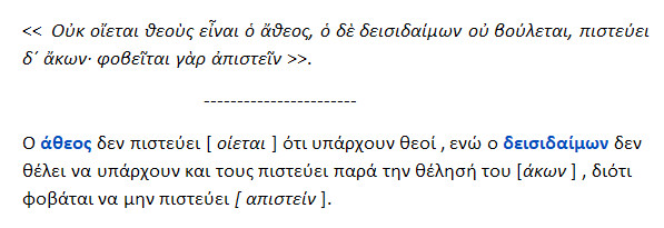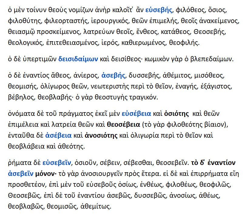 Η αθε’ί’α όμως έχει δύο σημασίες [ διττόν ] : η μία σημασία αντιτίθεται στην θεοσέβεια [ εναντίως τω θείω ] , η άλλη δηλώνει εκείνον ,που αγνοεί καθ’ ολοκληρίαν το θείον [ εξουθενωτικόν του θείου ] .