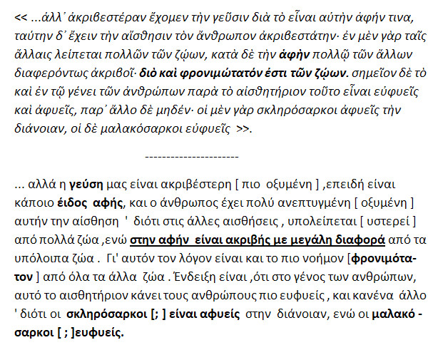 O άνθρωπος έχει πολύ οξυμένη την αίσθηση της αφής ‘ διότι ενώ στις άλλες αισθήσεις υστερεί από πολλά ζώα , στην αφή είναι ακριβής με μεγάλη διαφορά από τα υπόλοιπα . Γι’ αυτό είναι και το πιο νοήμον από όλα τα άλλα ζώα.