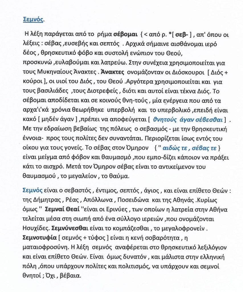 Σεμνός. Η λέξη παράγεται από το ρήμα σέβομαι { < ρ. *[ σεβ- ], απ’ όπου οι λέξεις : σέβας ,ευσεβής και σεπτός .