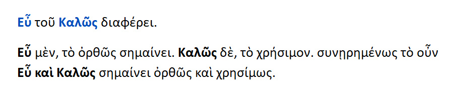Διαφέρει το ΕΥ από το ΚΑΛΩΣ . Το μεν ΕΥ = το ορθώς ,το δε ΚΑΛΩΣ = το χρήσιμον [ ~το χρησίμως ]. Μαζί δε » ευ και καλώς »= ορθώς και χρησίμως .
