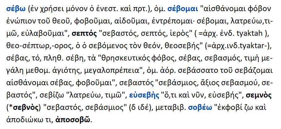 Σέβω [ κυρ. ] = οπισθοχωρώ ενώπιον τινός . Σέβομαι = αισθάνομαι φόβον ενώπιον του Θεού ,φοβούμαι ,αιδούμαι , [ε]ντρέπομαι , λατρεύω , τιμώ , ευλαβούμαι . Σεπτός =,σεβαστός, ιερός .Θεοσέπτωρ = ο σεβόμενον τον Θεόν, θεοσεβής. Σέβας [ τα σέβη ] = θρησκευτικός φόβος ,μεγάλη τιμή , αγιότης , μεγαλοπρέπεια .Σεβάζομαι = αισθάνομαι σέβας ,φοβούμαι .Σεβαστός = σεβάσμιος , άξιος σεβασμού .Σεβίζω = λατρεύω ,τιμώ Ευσεβής = σρμνός [ < σεβνός ] ,σεβαστός ,σεβάσμιος. Σοβέω = εκφοβίζω και αποδιώχνω κάτι ,αποσοβώ.