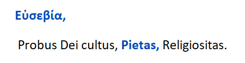 Ευσέβεια : pietas ,Probus [ = χρηστός , αγαθός ] Dei cultus [ λατρεία του Θεού ] , Religiositas [ = οσιότητα, θεοσέβεια, ευσέβεια , μερικές φορές και δεισιδαιμονία ].