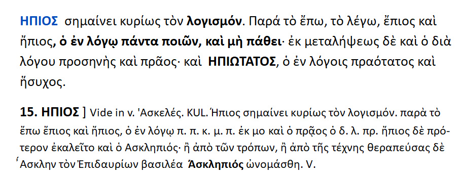 Ήπιος σημαίνει κυρίως τον λογισμόν. Από το έπω [ =λέγω ] ,έπιος — [ ε-> η ] —> ήπιος .Δηλαδή αυτός που όλα με λογική τα κάνει ,και δεν έχει πάθη ‘ από μετάληψη δε και αυτός που είναι προσηνής με τα λόγια και πράος. Και ηπιώτατος αυτός που είναι στα λόγια πραότατος και ήσυχος. Ήπιος δε νωρίτερα ονομαζόταν και ο Ασκληπιός ή από των τρόπων [ μεθόδων της ιατρικής τέχνης ] ή από την τέχνη [ ιατρική ].Ονομάστηκε δε Ασκληπιός επειδή θεράπευσε τον βασιλιά των Επιδαυρίων Άσκλην.