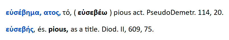 Ευσέβημα = pious act. Ευσεβής ,ές = pious , as a title .