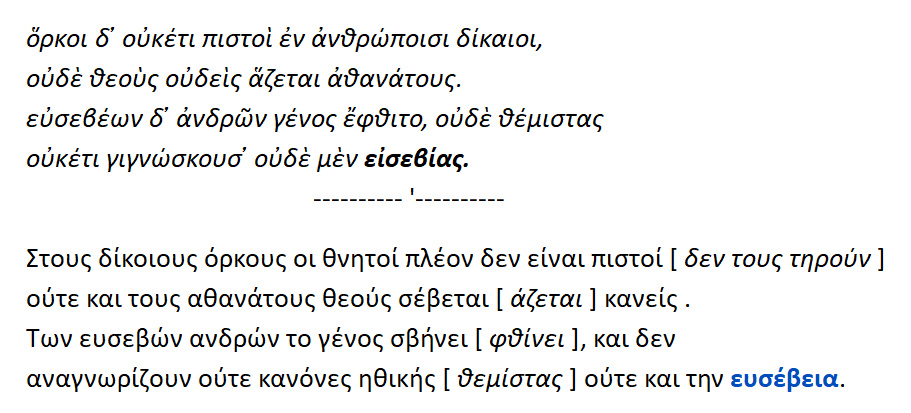 Των ευσεβών ανδρών το γένος σβήνει [ φθίνει ] , και δεν αναγνωρίζουν ούτε κανόνες ηθικής [ θεμίστας ] ούτε και την ευσέβεια.