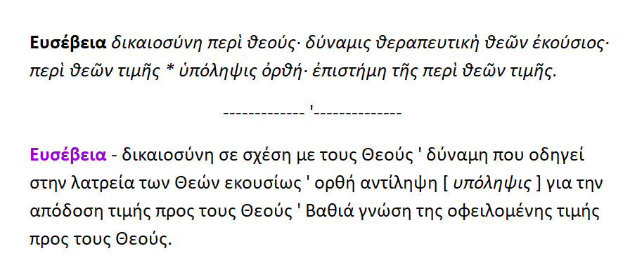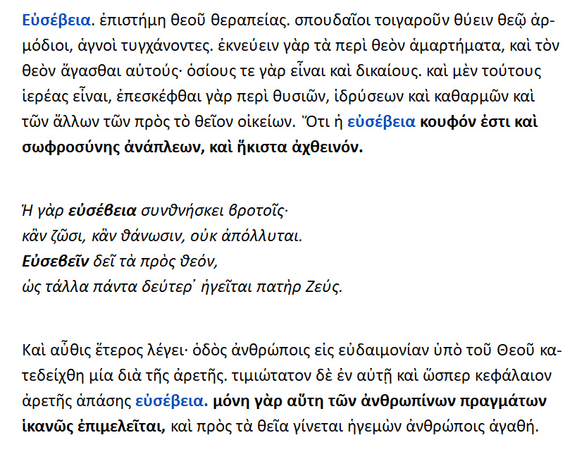 Ευσέβεια ή ευσεβία { Λατ. pietas } : θρησκευτική ευλάβεια προς ή περί τους Θεούς.