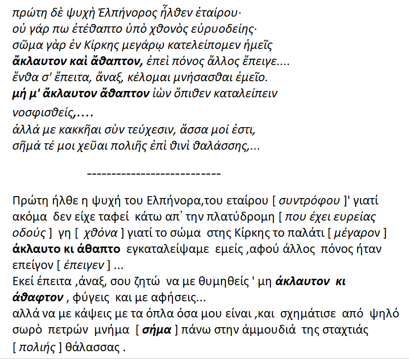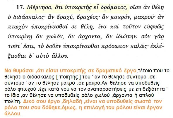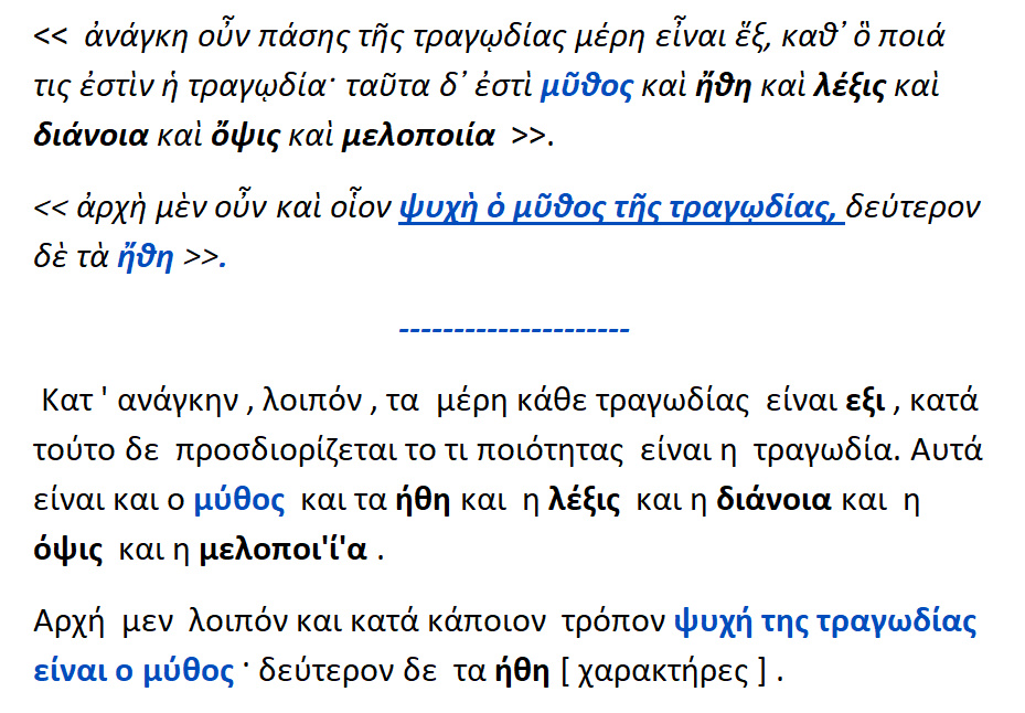 Από τα μέρη κάθε τραγωδίας [6] το πιο σπουδαίον είναι ο μύθος …..Δηλαδή ,εάν κάποια ή κάποιος αγνοεί τον μύθο που είναι το σπουδαιότερο από τα μέρη της τραγωδίας, τότε καλλίτερα να μην δει καμμία τραγωδία.
