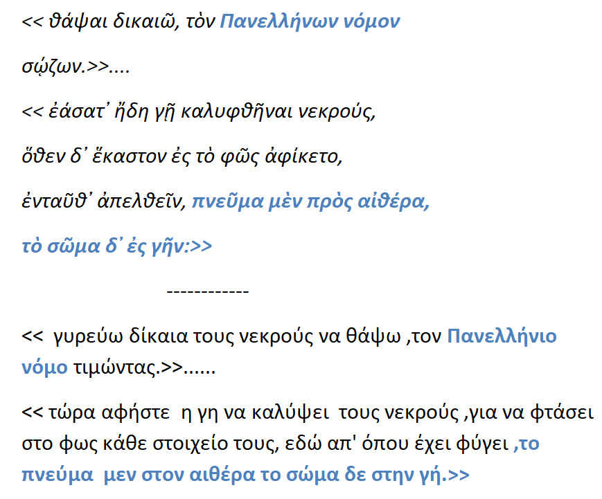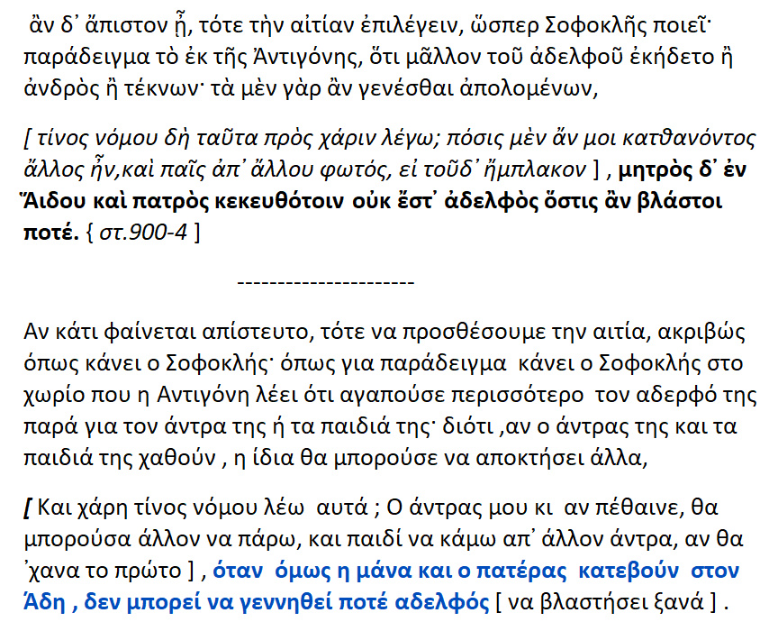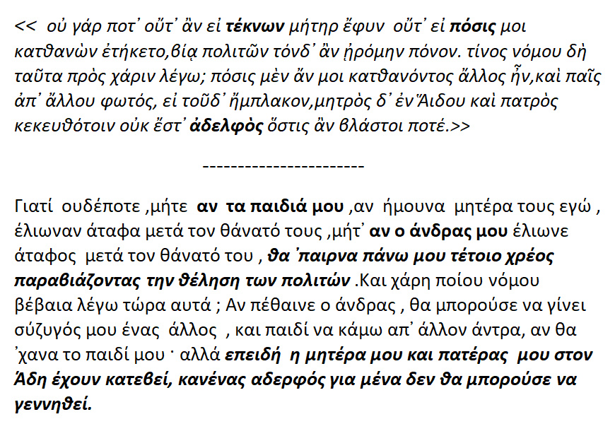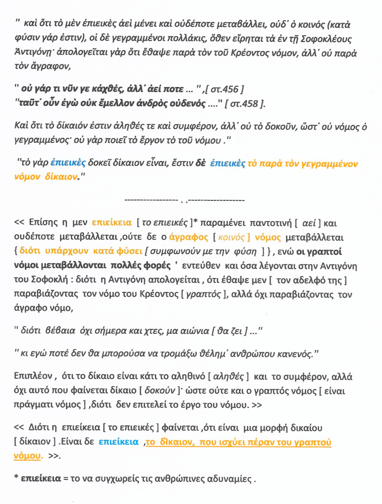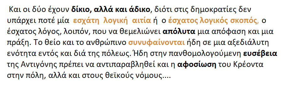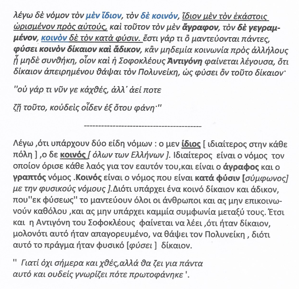 Λέγω ,ότι υπάρχουν δύο είδη νόμων : ο ίδιος [ ιδιαίτερος στην κάθε πόλη ] και ο κοινός [ όλων των Ελλήνων ]. Ίδιος είναι ο νόμος που έχει θεσπίσει κάθε λαός για τον εαυτόν του και χωρίζεται σε άγραφο και γραπτό. Κοινός είναι ο νόμος που είναι κατά φύσιν [ σύμφωνος με τους φυσικούς νόμους ].Διότι υπάρχει ένα κοινό δίκαιον και άδικον, που »εκ φύσεως» το μαντεύουν όλοι οι άνθρωποι. Έτσι η Αντιγόνη ,λέει ,ότι είναι δίκαιον, αν και παράνομο, να θάψει τον Πολυνείκη , διότι αυτό είναι φυσικό [ φύσει ] δίκαιον.