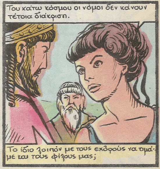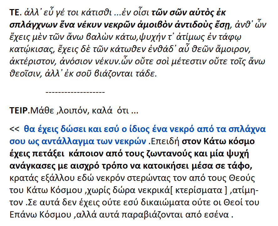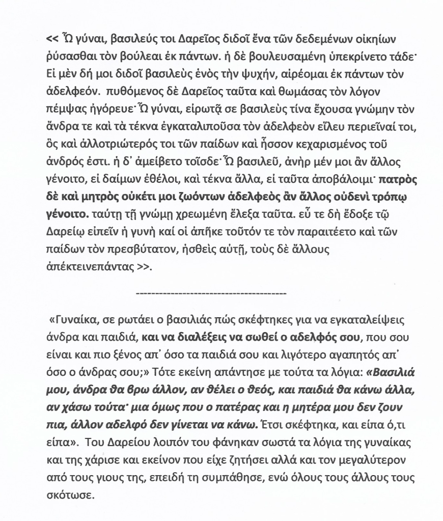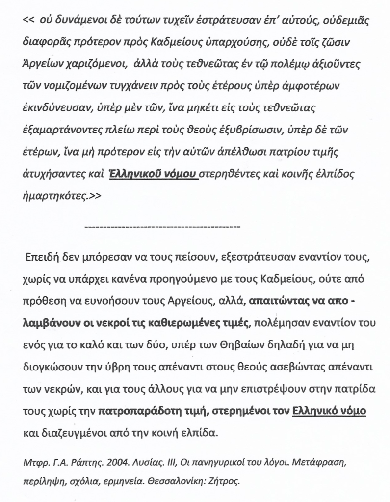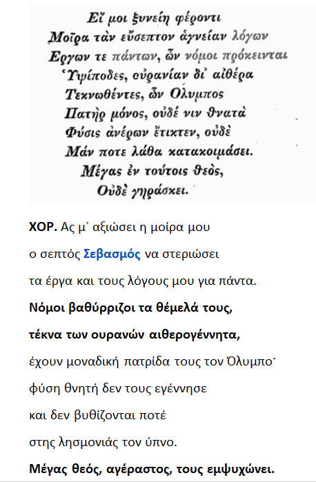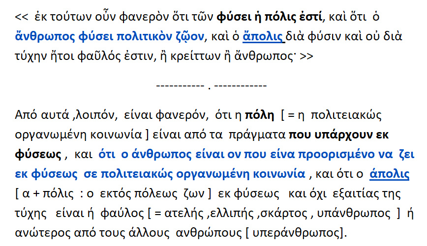 Λέγω ,ότι υπάρχουν δύο είδη νόμων : ο ίδιος [ ιδιαίτερος στην κάθε πόλη ] και ο κοινός [ όλων των Ελλήνων ]. Ίδιος είναι ο νόμος που έχει θεσπίσει κάθε λαός για τον εαυτόν του και χωρίζεται σε άγραφο και γραπτό. Κοινός είναι ο νόμος που είναι κατά φύσιν [ σύμφωνος με τους φυσικούς νόμους ].Διότι υπάρχει ένα κοινό δίκαιον και άδικον, που »εκ φύσεως» το μαντεύουν όλοι οι άνθρωποι. Έτσι η Αντιγόνη ,λέει ,ότι είναι δίκαιον, αν και παράνομο, να θάψει τον Πολυνείκη , διότι αυτό είναι φυσικό [ φύσει ] δίκαιον.