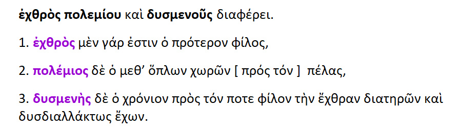 Διαφέρει [ η λέξη ] εχθρός από τον πολέμιον και τον δυσμενή. Εχθρός είναι αυτός που ήταν προηγουμένως φίλος. Πολέμιος είναι αυτός που προχωράει με όπλα εναντίον του γείτονα .Δυσμενής [ δυσ -μένος ] είναι αυτός που διατηρεί χρόνια έχθρα προς τον κάποτε φίλον του και δύσκολα διαλλάσσεται [ συμφιλιώνεται ] με αυτόν .