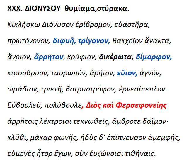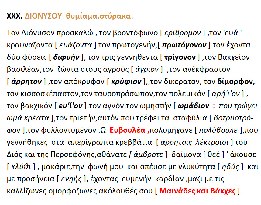 ΟΡΦΙΚΑ – » Διονύσου θυμίαμα ,στύρακα » [ ΧΧΧ ].