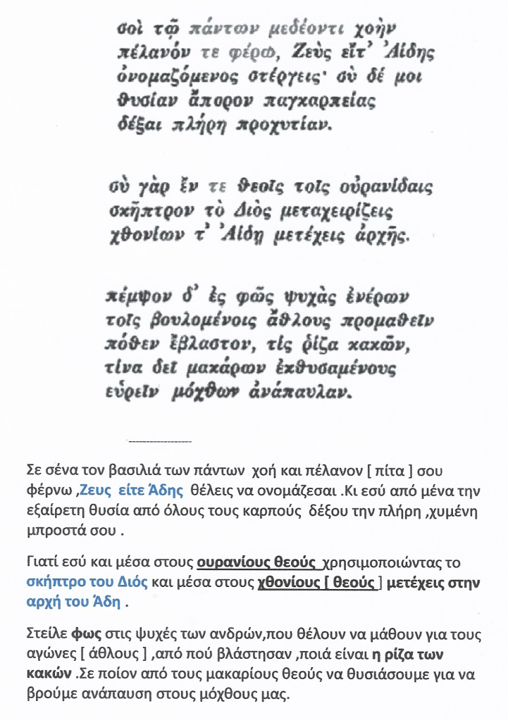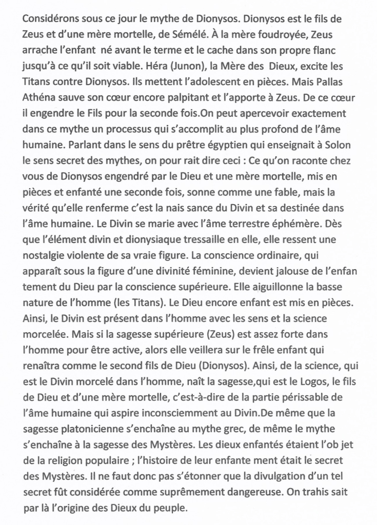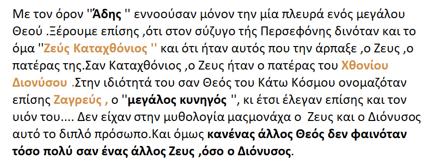 Με τον όρον » Άδης » εννοούσαν μόνον την μία πλευρά ενός μεγάλου Θεού .Ξέρουμε ,επίσης ,ότι στον σύζυγο τής Περσεφόνης δινόταν και το όνομα ‘‘Ζεύς Καταχθόνιος » και ότι ήταν αυτός που την άρπαξε ,ο Ζευς ,ο πατέρας της. Σαν Καταχθόνιος ,ο Ζευς ,ήταν ο πατέρας του Χθονίου Διονύσου .Στην ιδιότητά του ως Θεός του Κάτω Κόσμου ονομαζόταν επίσης ‘Ζαγρεύς ‘, ο »μεγάλος κυνηγός », κι έτσι έλεγαν επίσης και τον υιόν του…. Δεν είχαν στην μυθολογία μας μονάχα ο Ζευς και ο Διόνυσος αυτό το διπλό πρόσωπο. Και όμως κανένας άλλος Θεός δεν φαινόταν τόσο πολύ σαν ένας άλλος Ζευς ,όσο ο Διόνυσος.
