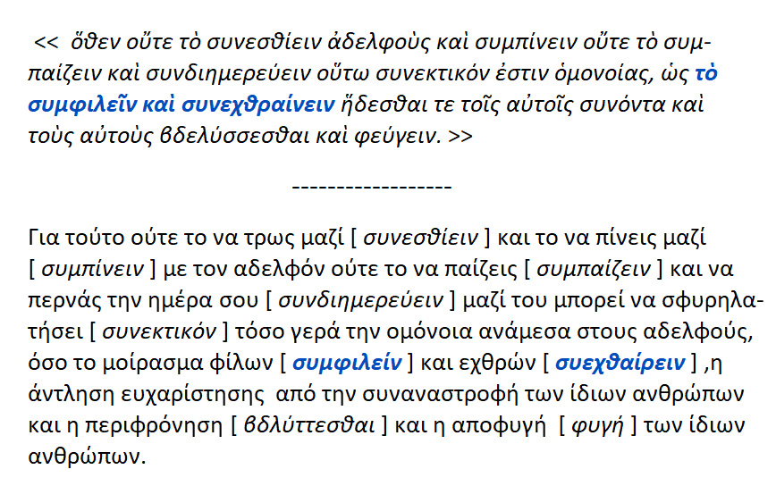 Την ομόνοια ανάμεσα στους αδελφούς την σφυρηλατεί το μοίρασμα φίλων [ συμφιλείν ] και εχθρών [ συνεχθαίρειν ] ,η άντληση ευχαρίστησης από την συναναστροφή των ίδιων ανθρώπων , η περιφρόνηση [ βδελύττεσθαι < βδέω = αισθάνομαι αποστροφή ,απεχθάνομαι ] και η αποφυγή των ίδιων ανθρώπων.