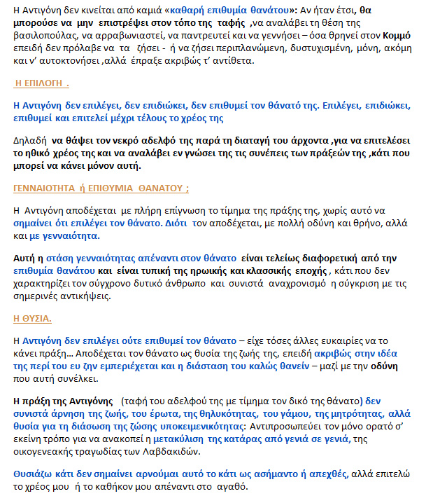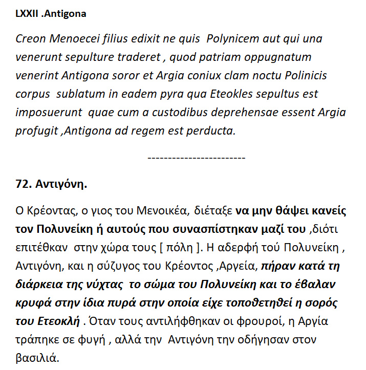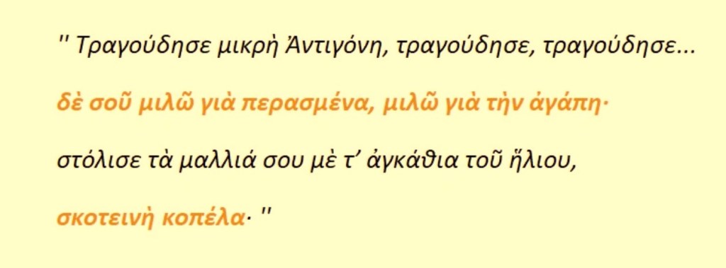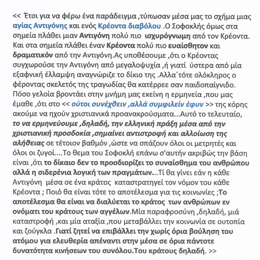 Όποια και όποιος αγνοεί την τραγωδία και τον μύθον της »Αντιγόνης» να μην προχωρήσει στην ανάγνωση του παρακάτω κειμένου . Πρώτα πρέπει να διαβάσει την τραγωδία ή τουλάχιστον την υπόθεση [ μύθο ] της τραγωδίας και μετά να συνεχίσει.