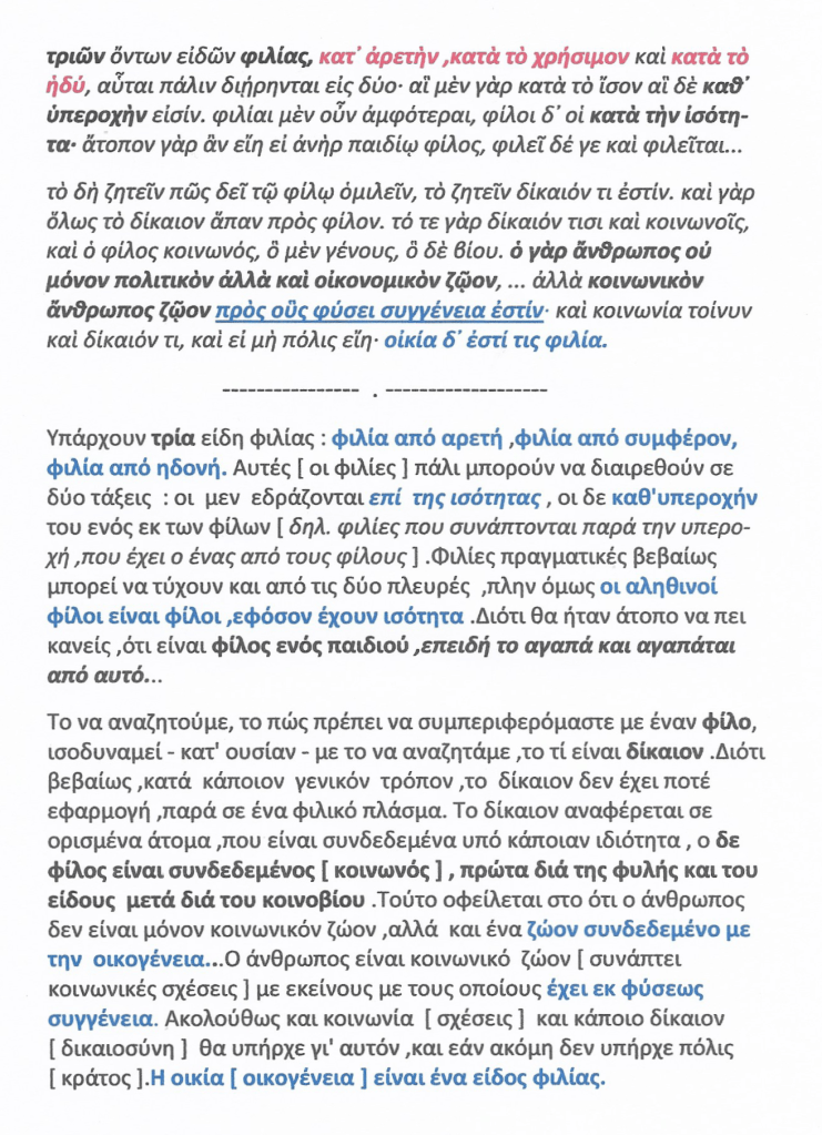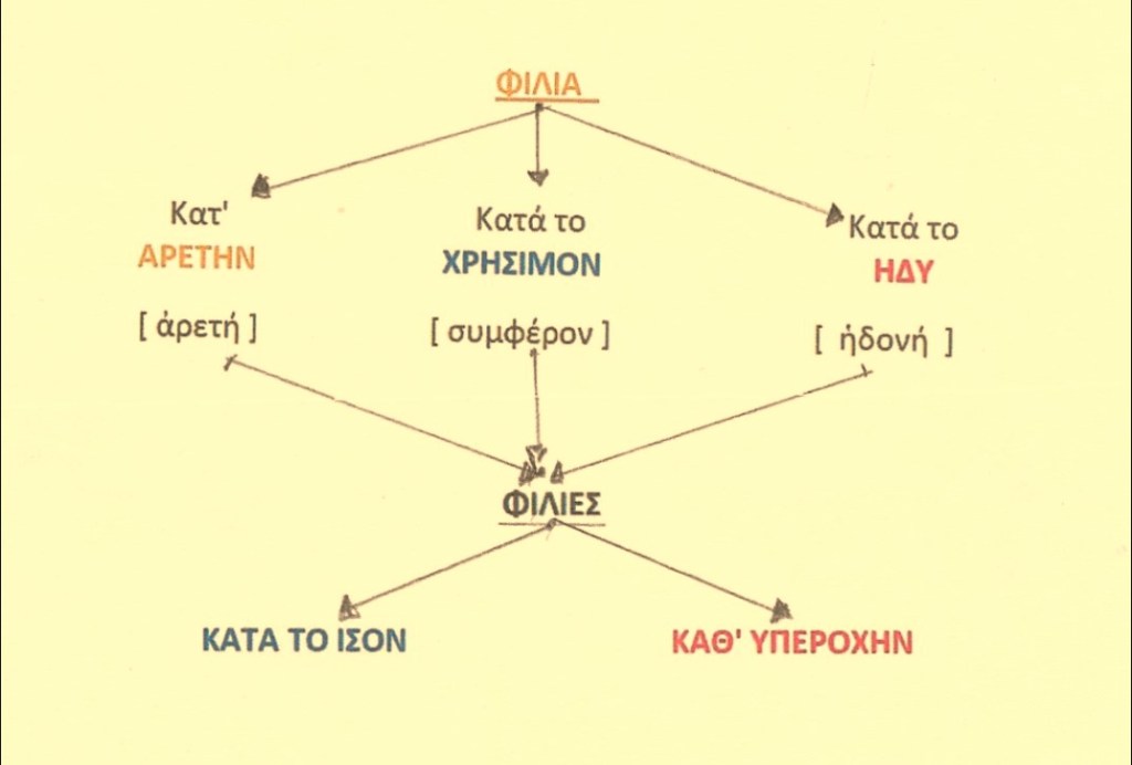 Υπάρχουν τρία [ 3 ] είδη φιλίας : φιλία από αρετή ,φιλία από συμφέρον ,φιλία από ηδονή. Αυτές [ οι φιλίες ] πάλι μπορούν να διαιρεθούν σε δύο τάξεις : οι μεν εδράζονται επί της ισότητας , οι δε συνάπτονται παρά την υπεροχή του ενός από τους φίλους.