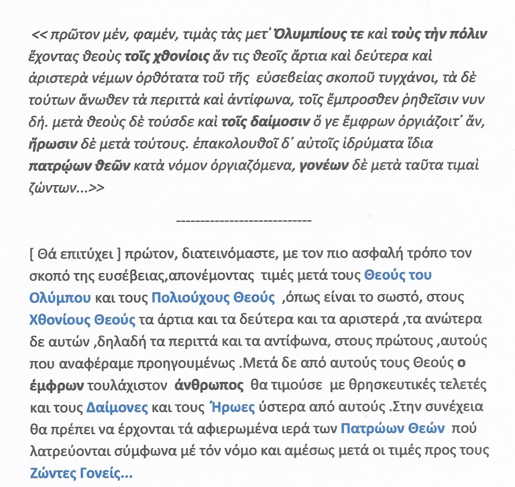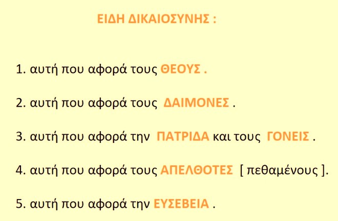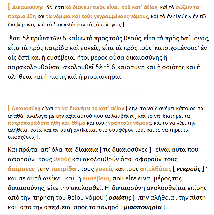 Η Δικαιοσύνη είναι αρετή της ψυχής διανεμητική [= που διανέμει ,μοιράζει ] του κατ’ αξίαν [ =δίνοντας στον κάθε έναν αυτά που του αξίζουν ]… Πρώτη ,από όλα τα είδη της δικαιοσύνης, είναι εκείνη που αφορά τους Θεούς.