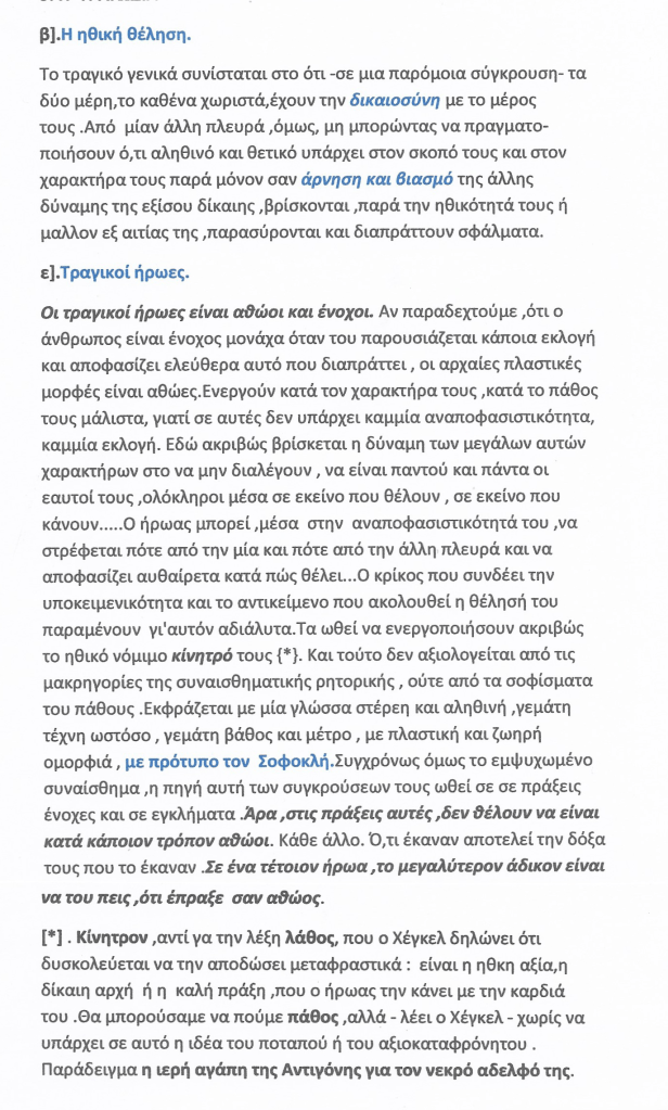 β].Η ηθική θέληση. Το τραγικό γενικά συνίσταται στο ότι σε μια σύγκρουση-τα δύο μέρη, το καθένα χωριστά, έχουν την δικαιοσύνη με το μέρος τους . ε].Τραγικοί ήρωες : Ό,τι έκαναν αποτελεί την δόξα τους που το έκαναν .Σε ένα τέτοιον ήρωα ,το μεγαλύτερον άδικον είναι να του πεις ,ότι έπραξε σαν αθώος. { Πρόκειται για την τιμή στους μεγάλους αυτούς χαρακτήρες να είναι ένοχοι. Δεν θέλουν να ξυπνήσουν την συμπάθεια και τον οίκτο. Διότι δεν είναι η ψυχική δύναμη ,είναι οι μεταπτώσεις του Ήρωα που μας κάνουν και συμπαθούμε τις δυστυχίες του και γεννιέται μέσα μας ο θαυμασμός ].