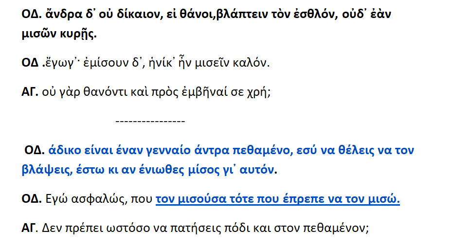 Aυτός ο στίχος [ 523 ] από το Β’ ΕΠΕΙΣΟΔΙΟ θεωρείται ίσως ως ο πιο διάσημος στην ‘Αντιγόνη του Σοφοκλέους . Διάσημος και παράλληλα αινιγματικός .Πάνω σε αυτόν έχουν οικοδομηθεί πολλές και ποικίλες ερμηνείες . Η Αντιγόνη στην στιχομυθία που ακολουθεί με τον Κρέοντα δηλώνει ,ότι » είναι γεννημένη να αγαπάει [ φιλείν ] και όχι να μισεί [ εχθαίρειν ] » .