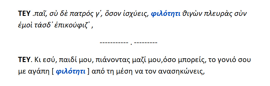 ΓΡΑΜΜΑΤΙΚΗ ΑΝΑΓΝΩΡΙΣΗ : Συμφιλείν του ρ .[ συν + φιλέω-ώ ] : ενεργητική φωνή , ενεστώτας χρόνος , απα-ρέμφατον . Συνέχθειν του ρ. [ συν + εχθαίρω } : ενεργητική φωνή , ενεστώτας χρόνος ,απαρέμφατον. Το ρήμα συμ–φιλέω-ώ ,όπως και το συνέχθω { ποιητικός τύπος του συνεχθαίρω } είναι συνθέσεις αποκλειστικά του Σοφοκλέους . Δεν εντοπίζονται στην αρχαία ελληνική γραμματεία πριν από τον Σοφοκλή.