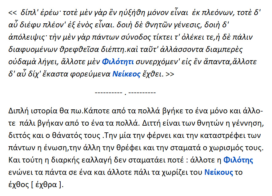 Κατά τον Εμπεδοκλή : τα τέσσερα [ 4 ] στοιχεία [ αήρ-πυρ-γη-ύδωρ ] ,που κάποτε συνυπήρχαν ενωμένα στον Σφαίρο ,διαχωρίστηκαν από το Νείκος ,που ήταν μία δύναμη ξέχωρα από αυτά .Στην συνέχεια επενέβαινε η Φιλότης ,μία δύναμη και αυτή ξεχωριστή και τα ενοποιούσε . ‘Υπάρχει ακόμη ένας ύψιστος νόμος του σύμπαντος ,η Ανάγκη ,που είναι η μεταβολή από το Ένα στα Πολλά -υπό το κράτος του Νείκους [ έριδας] – και από τα Πολλά σε Ένα – υπό το κράτος της Φιλότητος [ φιλίας ].