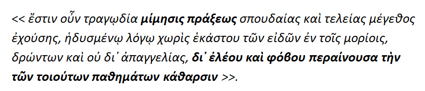 Σύμφωνα με το » Περί ποιητικής » του Αριστοτέλους, η τραγωδία είναι μίμηση [ κάποιας ] πράξεως σπουδαίας [ αξιόλογης ] και τελείας [ δηλ. πράξεως ολοκληρωμένης , που έχει αρχή ,μέση και τέλος ] ,η οποία έχει καθορισμένο μέγεθος [ ούτε λίγο, ούτε πολύ ] ,με λόγον ηδυσμένον* [ που έχει ρυθμό ,αρμονία, μελωδία ] και το κάθε είδος αυτών των »ηδυσμάτων » χρησιμοποιείται χωριστά στα διάφορα μέρη της τραγωδίας .Η μίμηση γίνεται διά δράσεως και όχι διά απαγγελίας [ αφήγησης ] που επιφέρει διά του ελέους και του φόβου την κάθαρση [ εξαγνισμός ] των τέτοιου είδους παθη-μάτων [ ψυχικών καταστάσεων ]. Όλη αυτή η διδασκαλία είναι τρόπον τινά μία ομοιοπαθητική μέθοδος της αναβιώσεως του πόνου .Δηλαδή οι θεατές ,όταν διεγερθούν και αρχίσουν να συναισθάνονται έλεος [ συμπάθεια ,επειδή συμπάσχουν με τον πρωταγωνιστή ] και οίκτο [ επειδή ο πρωταγωνιστής παθαίνει κάτι ,που δεν άξιζε να το πάθει ] και φόβο [ μην πάθουν και αυτοί το ίδιο ] ,τότε από αυτά τα καθορισμένα παθήματα γεννιούνται αυτά τα συναισθήματα του πόνου ,τα οποία μέσω των δακρύων ,λυτρώνονται και οδηγούνται στην ψυχική κάθαρση . *ηδυσμένος [ < ηδύνω ] : κάνω κάτι ηδύ [ = γλυκό ] , νόστιμο, αρταίνω, καρυκεύω, νοστιμίζω.