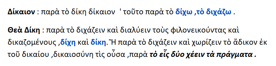 Το πάντα σχετικό ανθρώπινο δίκαιον ,όταν φτάσει στο απόλυτο δίκαιο , γίνεται άδικον [ πέρασμα στο αντίθετό του ].Γι’ αυτό ο δικαστής είναι και διχαστής , επειδή το δίκιο πάντα διχάζεται , δεν έχει αποκλειστικότητα , δεν μεροληπτεί.