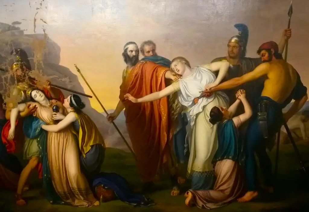 << Η χήρα του Φωκίωνα περισυλλέγει τις στάχτες του >>. Ο Αθηναίος πολιτικός και στρατηγός Φωκίων εκτελέστηκε αδίκως για προδοσία τον 4ον αι. π.Χ. Το σώμα του μεταφέρεται κρυφά έξω από την περιοχή της Ελευσίνος ,στα σύνορα των Αθηνών. Εκεί η γυναίκα του παίρνοντας φωτιά από την Μεγαρική γη καίει το σώμα του , μαζεύει κρυφά και κρύβει τις στάχτες του παρανόμως.