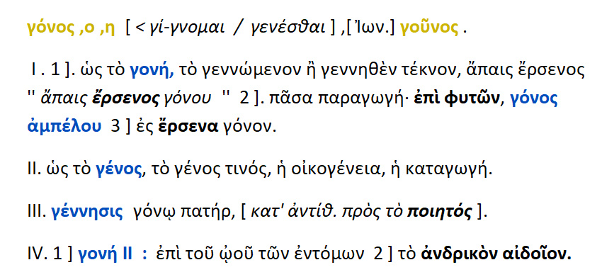 Γόνος [ ο και η ] , γούνος [ Ἰων.] < γί-γνομαι / γενέσθαι .