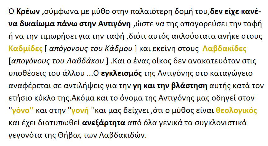 Ο Κρέων ,σύμφωνα με μύθο στην παλαιότερη δομή του, δεν είχε κανένα δικαίωμα πάνω στην Αντιγόνη ,ώστε να της απαγορεύσει την ταφή ή να την τιμωρήσει για την ταφή .Το όνομα της Αντιγόνης μας οδηγεί στον »γόνο’‘ και στην »γονή »και μας δείχνει ,ότι ο μύθος είναι θεολογικός .