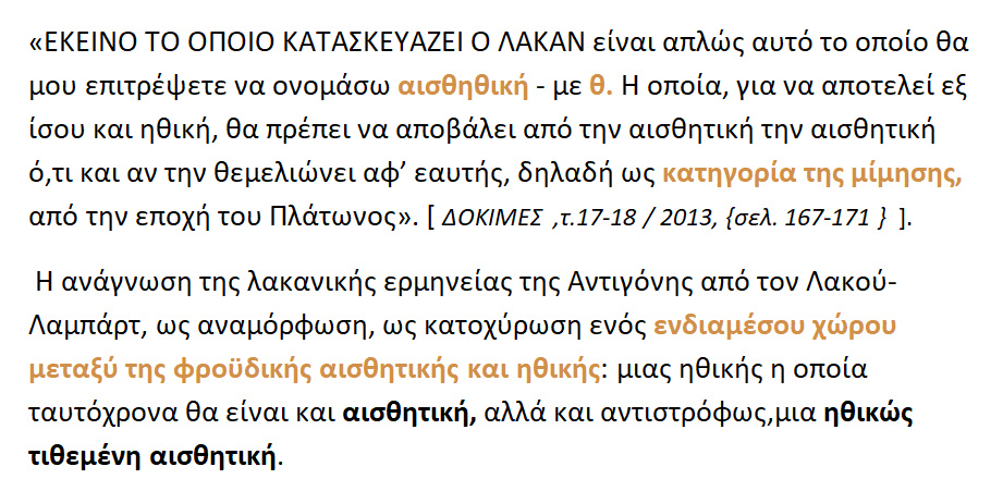 ΔΟΚΙΜΕΣ [ 17-18 , 2013 ] .ΝΙΚ. ΠΑΠΑΧΡΙΣΤΟΠΟΥΛΟΥ – ‘‘ Ο Λακού-Λαμπάρτ και η λακανική αισθ-ηθική »,{σελ. 167-171 }