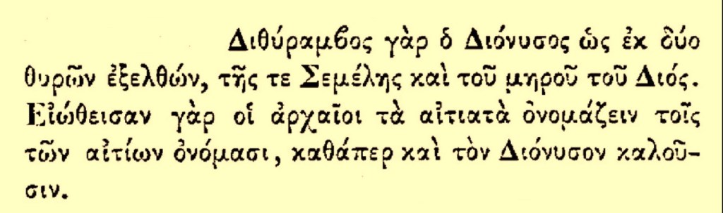 Διθύραμβος λέγεται ο Διόνυσος ,διότι εξήλθε από δύο »θύρες» ,και από την Σεμέλη και από τον μηρό του Διονύσου. Διότι ,όπως συνήθιζαν οι αρχαίοι ,τα αιτιατά [ το αιτιατόν =αποτέλεσμα ] να τα ονομάζουν με τα αίτια των ονομάτων τους [ το αίτιον = αρχή, πηγή ] κατ’ αυτόν ακριβώς τον τρόπο αποκαλούν και τον Διόνυσον έτσι.