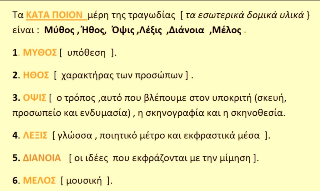 Κάθε τραγωδία αναγκαστικώς έχει έξι[ 6 ] μέρη : μύθος , ήθη , λέξις , διάνοια , όψις ,μελοποίησις . Αφετηρία και σαν ψυχή της τραγωδίας είναι ο μύθος [ μέρη του μύθου είναι και οι περιπέτειες και οι αναγνωρίσεις ] και δεύτερον οι χαρακτήρες.