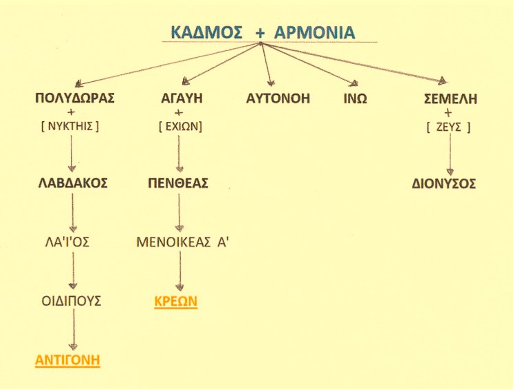 Οι γυναίκες της γενιάς του Κάδμου εμπλέκονται στον κύκλο της διονυσιακής λατρείας, είτε ως μητέρες φυσικές (Σεμέλη) και θετές (Ινώ), είτε ως αδελφές τους (Αγαύη, Αυτονόη) που αρνούνται την λατρεία του θεού Διονύσου. Όλες τους γεννούν αρσενικά παιδιά που όμως χάνονται σχεδόν όλα από τους γονείς τους. Η γενιά συνεχίζεται μόνο από το ζεύγος Νυκτηίς – Πολύδωρος.