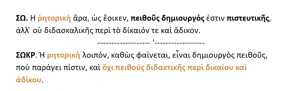 Η ουσία της ρητορικής τέχνης έγκειται στην πειθώ και στα μέσα που χρησιμοποιεί κάποιος με σκοπό να πείσει . Η ρητορική δεν διδάσκει τί είναι άδικον και τί δίκαιον, διότι ΔΕΝ έχει στόχο κα σκοπό το αγαθόν. Επειδή δε » Πασά τε επιστήμη, χωριζομένη δικαιοσύνης και της άλλης αρετής, πανουργία τις, και ου σοφία φαίνεται’‘ , η ρητορική τέχνη είναι »ψευδοεπιστήμη». Τρανή απόδειξη στην μετά Περικλέους εποχή ήσαν οι αδίστακτοι δημαγωγοί ,που λυμαίνονταν τον πολιτικό βίο των Αθηνών κολακεύοντας τις ταπεινές επιθυμίες του δήμου με σκοπό την χειραγώγησή του.