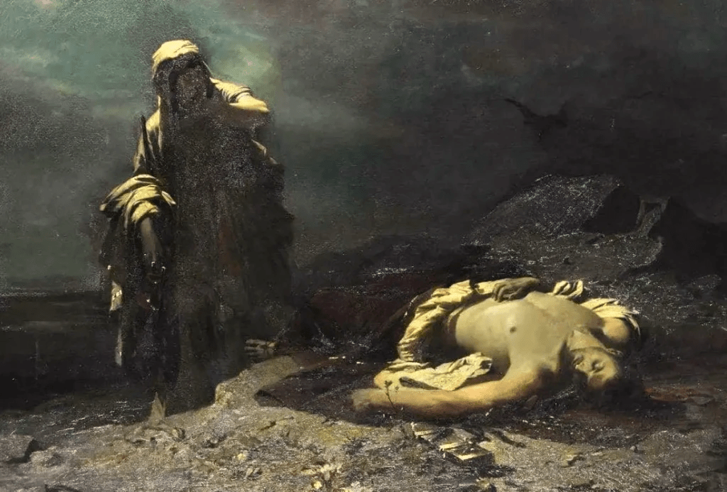 W. H. RINEHART – » Η Αντιγόνη χύνει σπονδή πάνω από το πτώμα του αδελφού της Πολυνείκη » { 1870 , Μητρ. Μουσείο Νέας Υόρκης }.