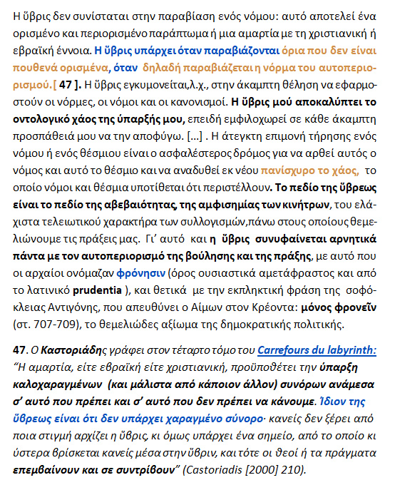 “Η δημοκρατία, όταν είναι αληθινή, είναι το καθεστώς που αρνείται ρητά κάθε έσχατη ‘εγγύηση’, και που δεν γνωρίζει άλλον περιορισμό από τον αυτοπεριορισμό του. […] Με άλλα λόγια, η δημοκρατία είναι το μόνο τραγικό πολιτικό καθεστώς — είναι το μόνο καθεστώς που διακινδυνεύει, που αντιμετωπίζει ανοιχτά τη δυνατότητα αυτοκαταστροφής του”. Με τη σκέψη αυτή συνδέεται τώρα ο αυτοπεριορισμός και η φρόνηση με την ύβριν, το εγγενές πρόβλημα του ελεύθερου ανθρώπου,,,,.».[ Castoriadis (1995) ,335 και (2000) ,203-204 ].