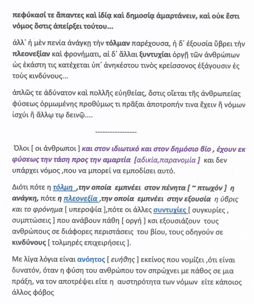 Όλοι άνθρωποι εκ φύσεως έχουν την τάση προς την αμαρτία [ αδικία, παρανομία ] εξ αιτίας της τόλμης ,της πλεονεξίας και των συγκυριών . Και δεν υπάρχει αυστηρός νόμος πολιτείας ή φόβος ικανός να τους αποτρέψει.