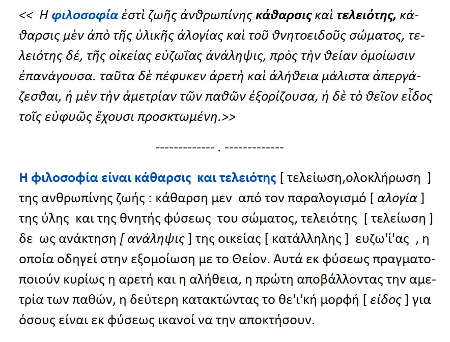 Η φιλοσοφία είναι κάθαρσις και τελειότης [ τελείωση, ολοκλήρωση ] του ανθρωπίνου βίου.