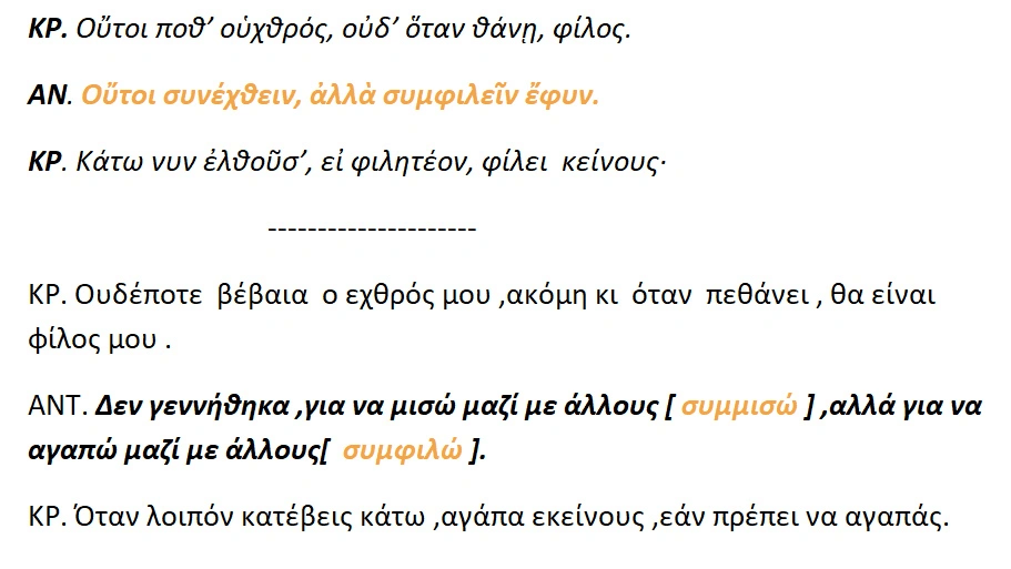 1. Η Αντιγόνη ; Ο πατέρας ήταν πατροκτόνος και αιμομίκτης , ο παππούς χειρότερος , η μητέρα αυτόχειρας , τα αδέλφια ,που ήσαν καταραμένα από τον πατέρα τους, αλληλοσφάχτηκαν ! Στην αδελφή της Ισμήνη συμπεριφέρεται με ψυχρότητα , περιφρόνηση ,εχθρότητα μέχρι το σημείο του μίσους ,όταν αυτή αρνείται να συμμετέχει στα σχέδια ταφής του νεκρού αδελφού .Η Ισμήνη ανήκει πλέον όχι στους φίλους ,αλλά στους εχθρούς. Φαίνεται να πλεονεκτεί ηθικώς -με την στοργική στάση ,που δείχνει στον νεκρόν αδελφό της – απέναντι στον Κρέοντα. Ουσιαστικά είναι μόνη και βλέπει παντού εχθρούς ,χωρίς το »συμφιλείν» . Και ως Αντι -γόνη θυσιάζοντας τον εαυτόν της αντιτίθεται στην σκυτάλη της οικογενειακής ύβρεως και σφραγίζει το ανόσιο 2. Ο Κρέων ; Ομιλεί για φίλους και εχθρούς αυτός που άφησε να θυσιαστεί [ ή αυτοθυσιάστηκε ] ο μονάκριβος γιός του ο Μενοικέας για την σωτηρία της πόλεως . Αυτός που έδιωξε τον Οιδίποδα από την πόλη . Αυτός που αρνείται την ταφή στον έναν ανεψιόν του ,ενώ τον άλλον καίτοι σφετεριστής του θρόνου τον θάβει με τιμές . Αυτός ο ισχυρογνώμων , που ακούει μόνον τον εαυτόν του και βλέπει παντού μόνον εχθρούς ,αλλά πουθενά φίλους .